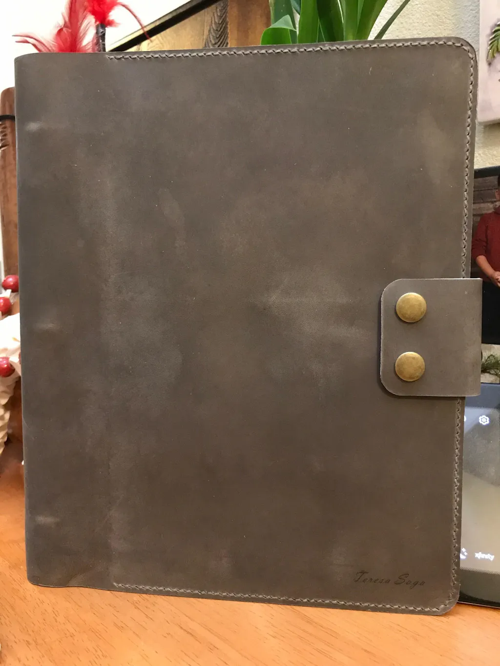This handcrafted leather 3 ring binder portfolio is made from full grain leather ,there is a standard metal 3 ring mechanism for holding loose letter 8.5 x 11 inch pages ,reports or use a plastic page protectors for document and photo .we take a careful design at the right part of this binder, so you could organize your card ,pen ,and some important notes ,enhance the use of this leather binder , there is a 1.5mm thickness kraft board at right side to be convenient for writing ,perfectly fit for your business trip and office use!