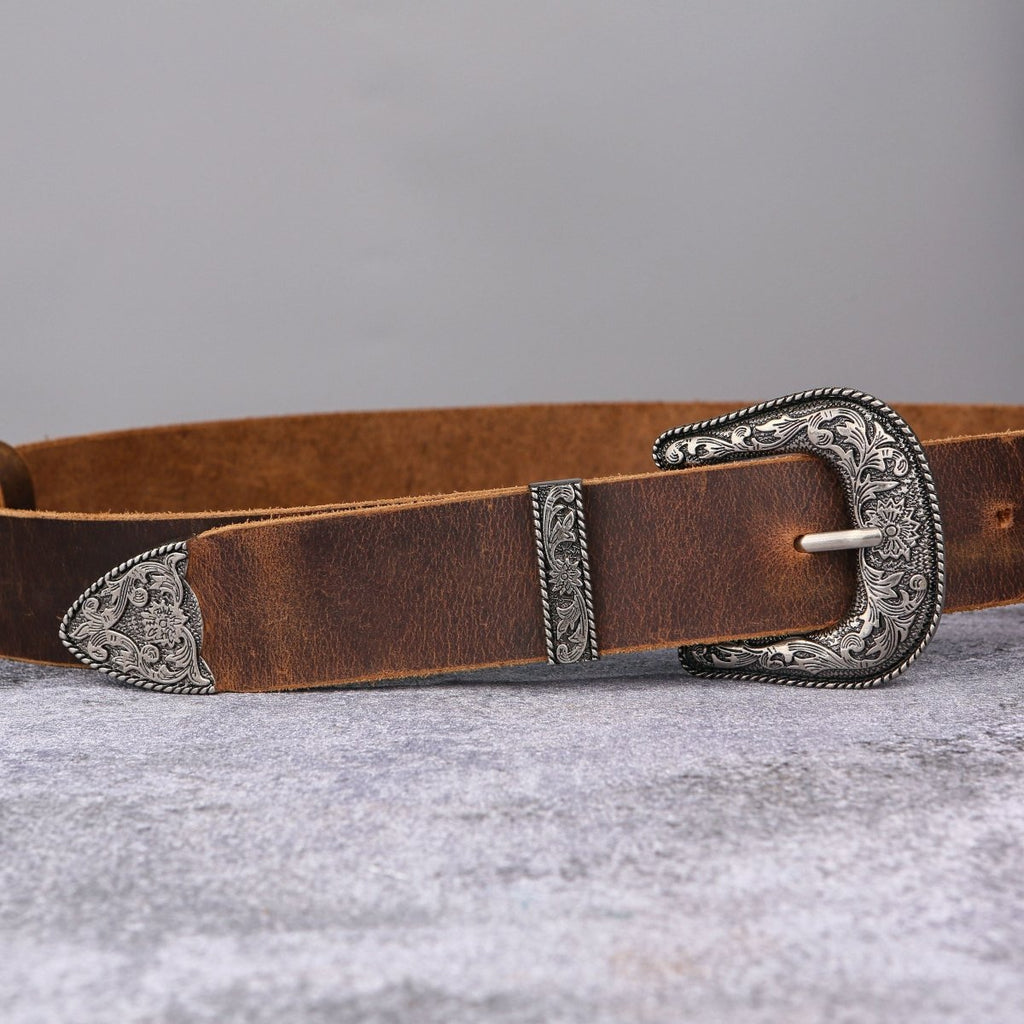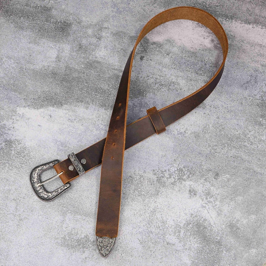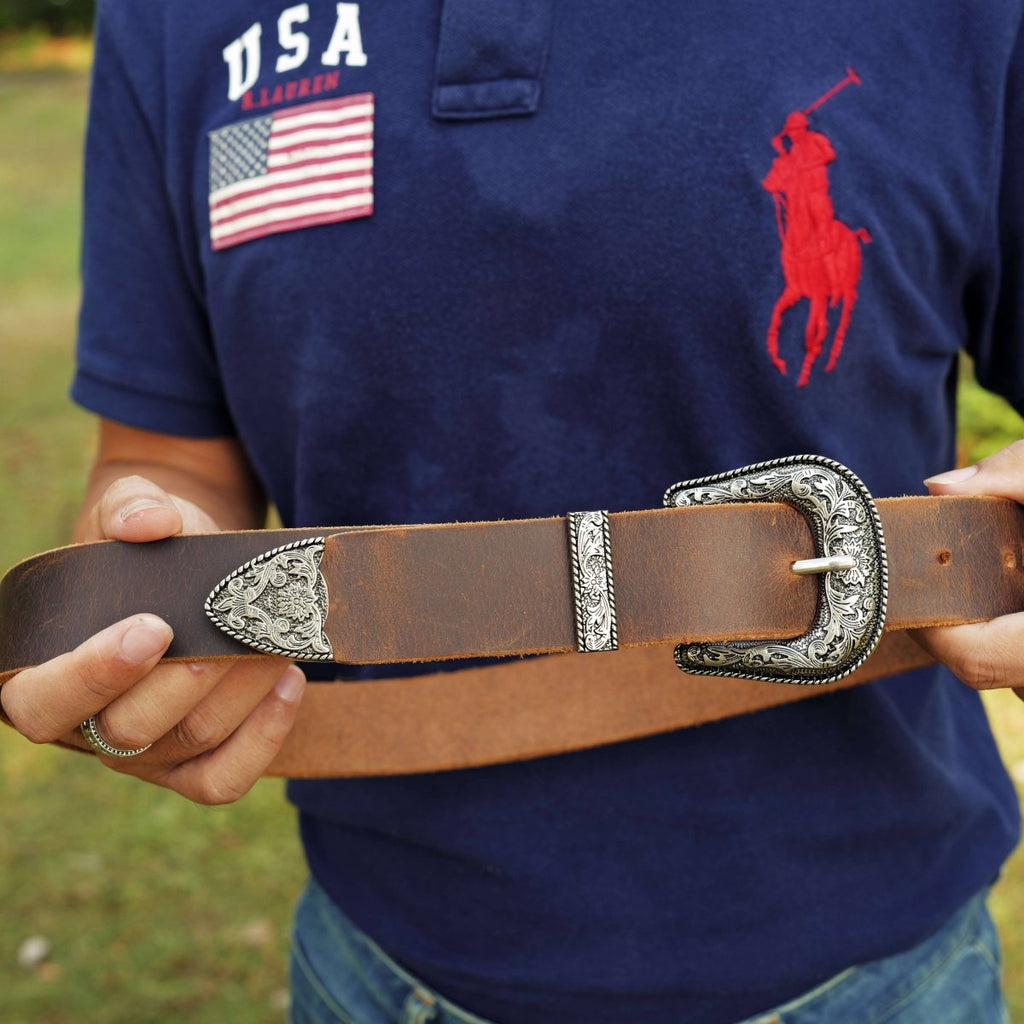 ✔ Western hardware set: Western engraved buckle, keeper, and tip in an antique silver tone.