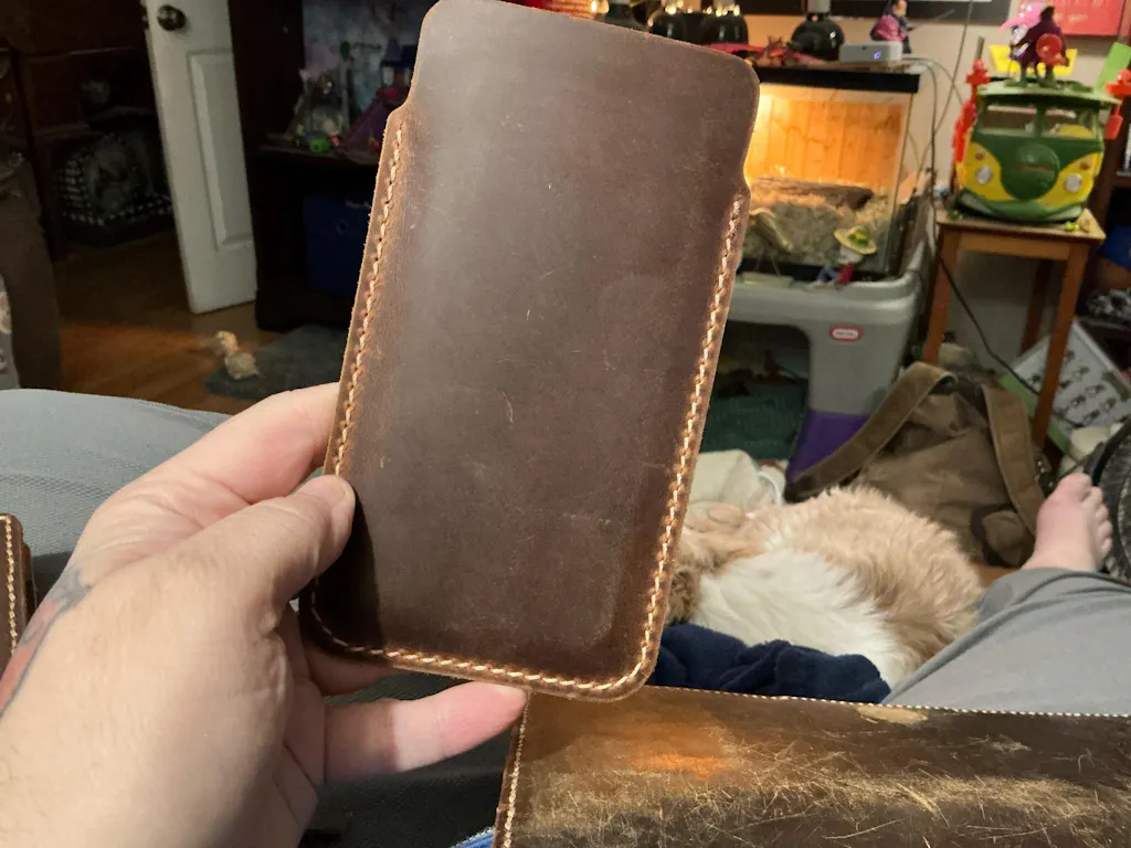 This minimal iPhone case is crafted from 1.8 mm thick distressed Brown leather and hand stitched with thickwaxed thread to ensure durability. this case will protect your large screen phone adequately when you put it into your bag or your pocket , we launched it for 10 years and do a further upgrade at 2023 according to customer's feedback