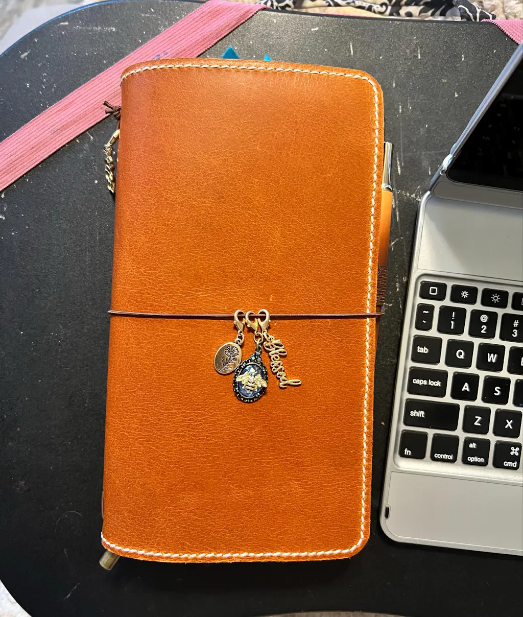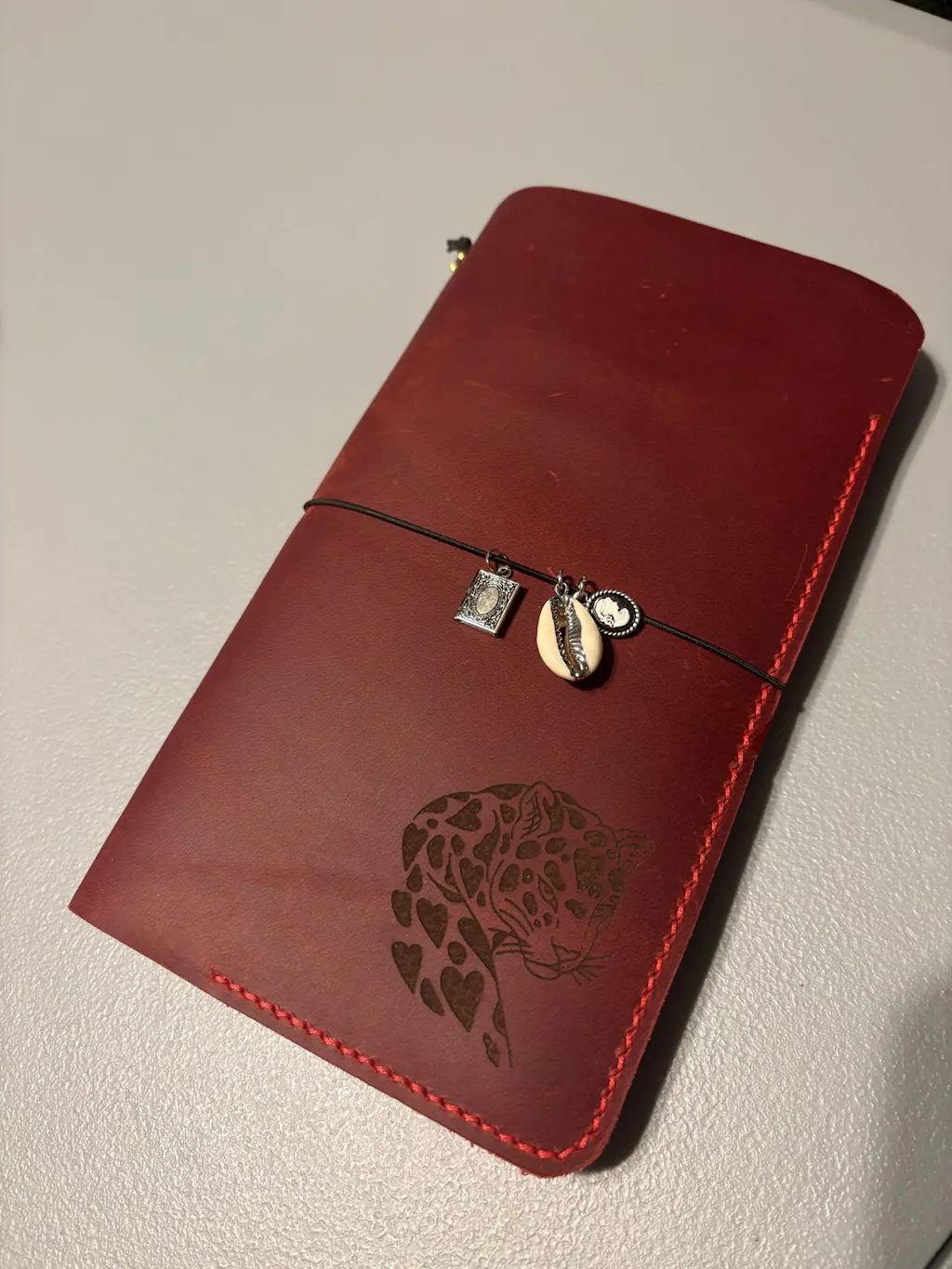 This is a asian midori style travel notebook ,we add the leather compartment at each side of leather cover . the natural cow leather is 2mm thick ,leather cover will age and become more beautiful with use. each scratch and mark make it even better ,it is perfect for travel and diary !