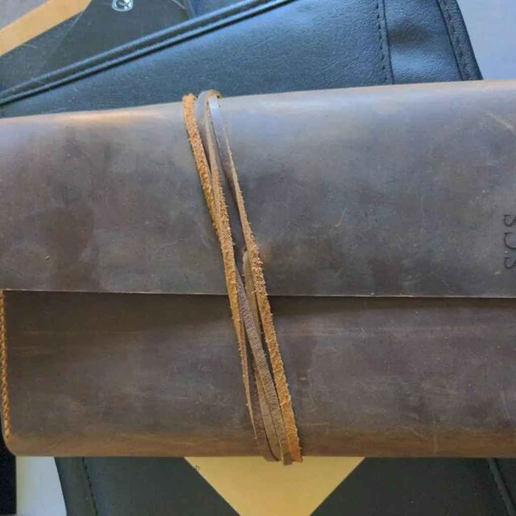 genuine leather , hand cut and hand sewn .. rustic looks and feel,will be aged beautifully over time